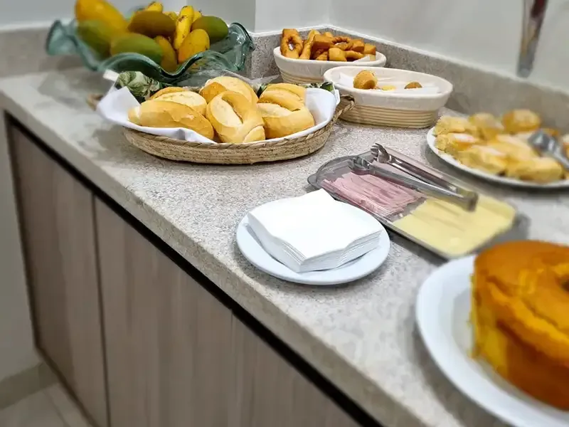 Nosso café contém diversas opções de frutas, bolos e salgados para que você inicie sua jornada de maneira confortável e tranquila.